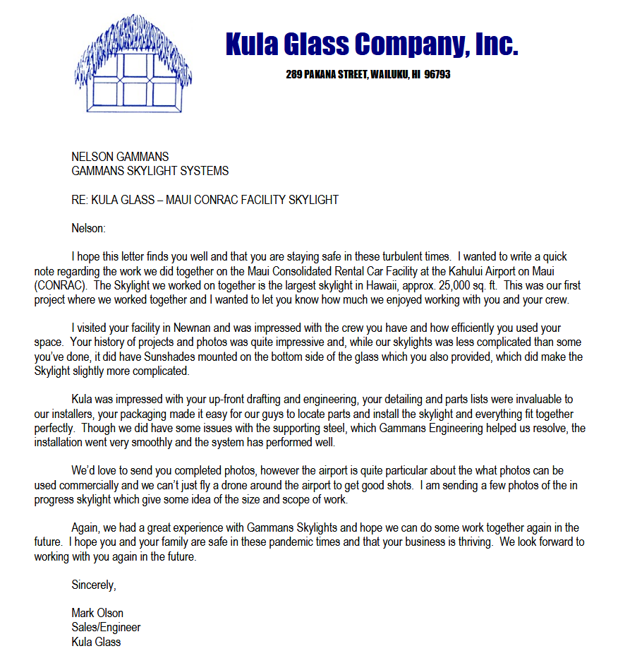 “The folks at Gammans stayed on top of this fast track project and it went very smoothly and quickly, paying attention to some tricky details and coordination. The quality of the product was excellent and the service was unsurpassed. This unique custom curved skylight is a highlight of this new addition to the airport here in Jacksonville. I would recommend the folks at Gammans for any of your skylight requirements.”